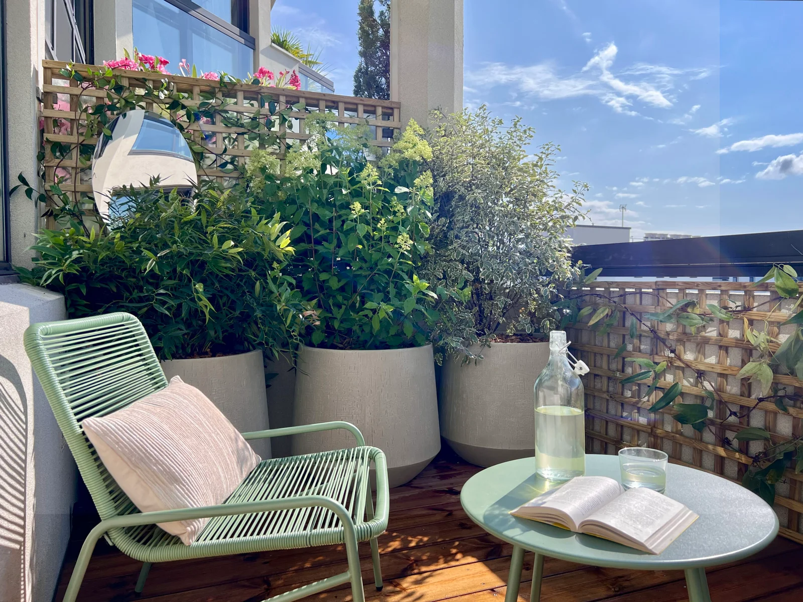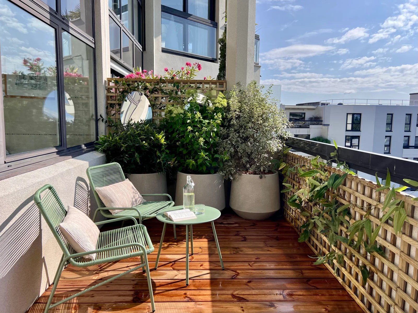 Agave paysage a transformé son balcon de A à Z :Terrasse bois, végétalisation, arrosage automatique, mobilier, éclairage.