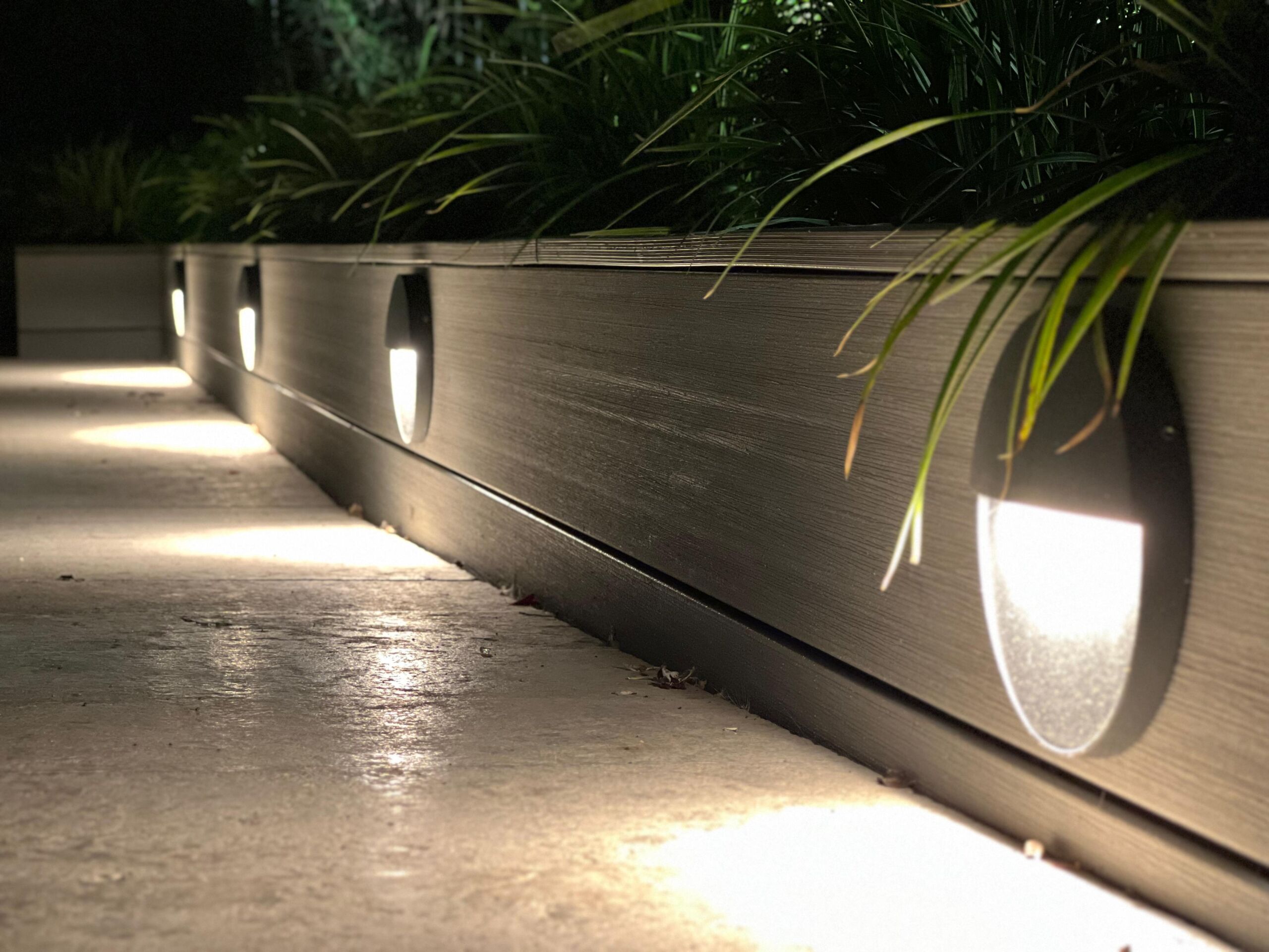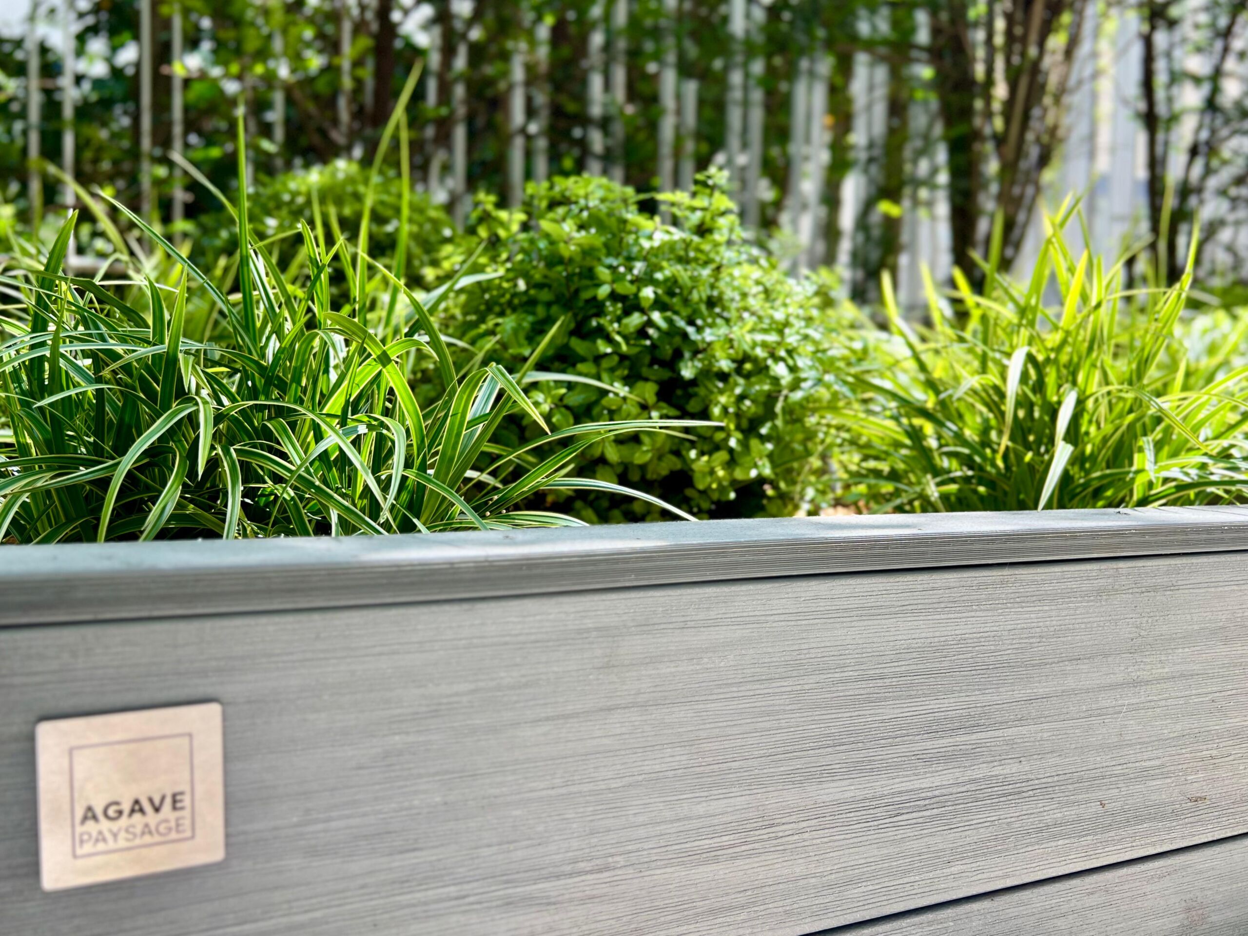 Bordure composite, végétalisation, éclairage, arrosage