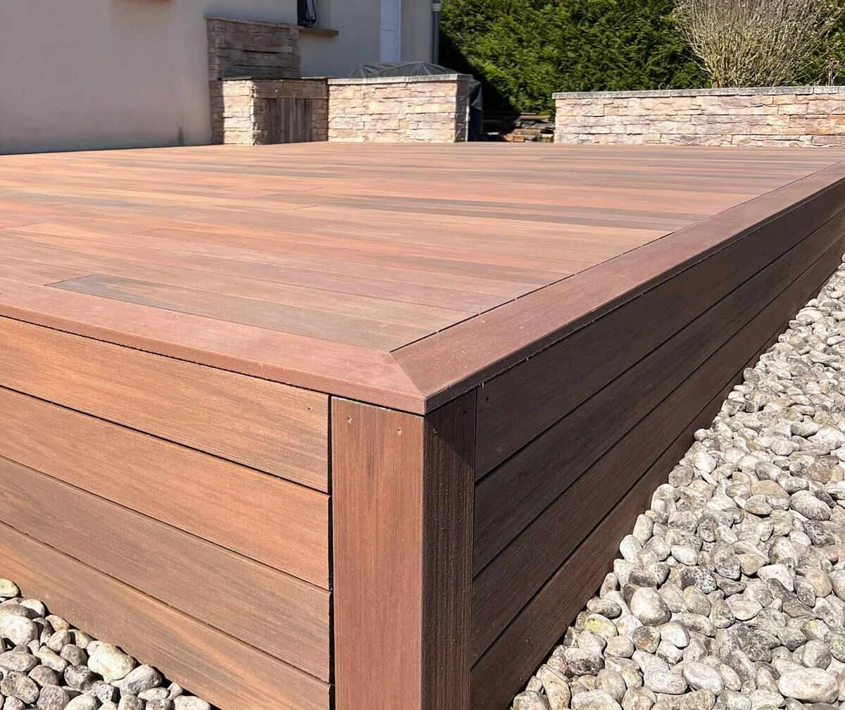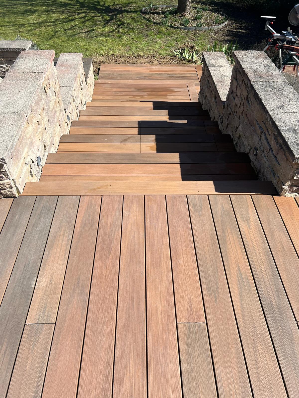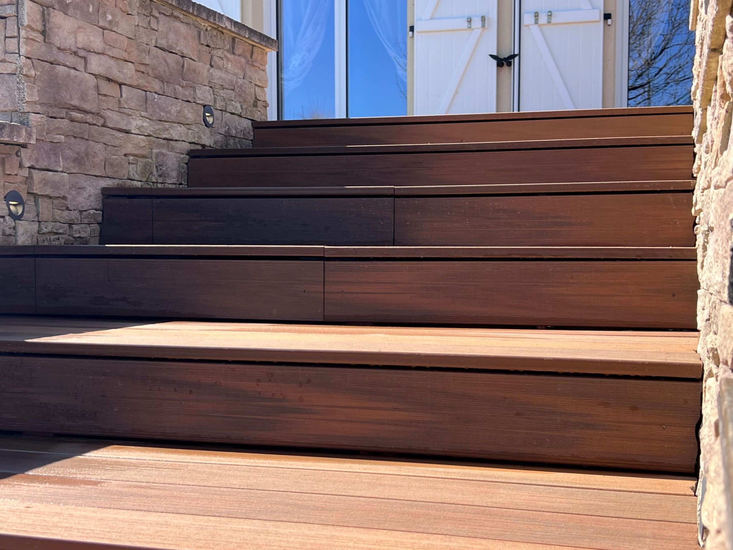 Nos clients souhaitaient refaire leur terrasse hors d'usage. Nous leur avons proposé une terrasse en composite made in Bretagne. Ce matériaux durable demande peu d'entretien et ne change pas de couleur dans le temps.